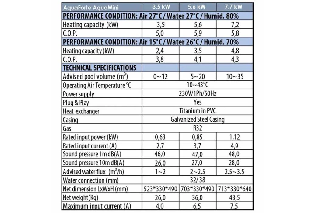 In de tabel hiernaast zie je alle specificaties van de serie AquaMini warmtepompen onder elkaar. Voor een complete uitleg kun je nog eens de uitgebreide handleiding doornemen, deze is te vinden onder het kopje “downloads”. Bij vragen neem dan gerust contact met ons op!
