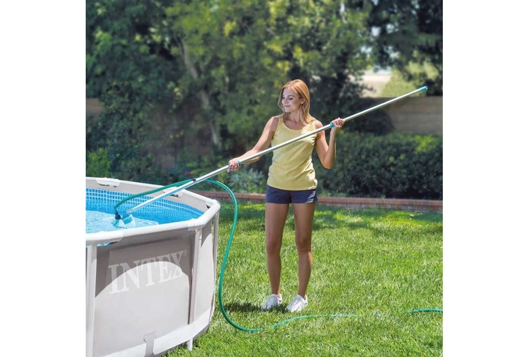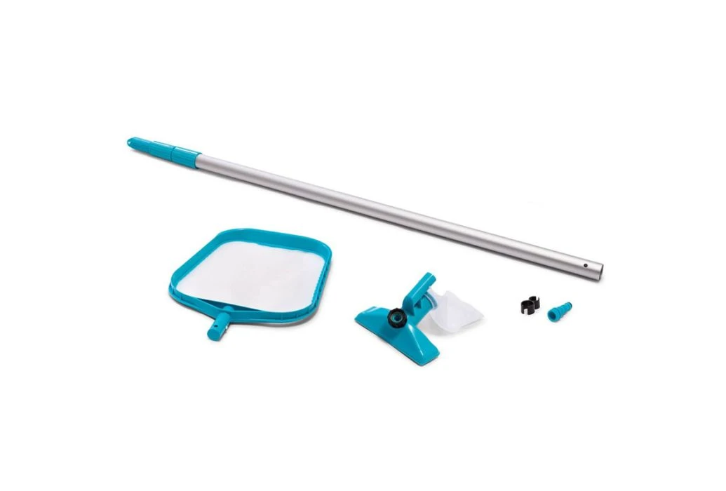 Met deze Intex onderhoudsset is je zwembad eenvoudig schoon te maken. De onderhoudsset bevat een stofzuiger welke aan te sluiten is op een tuinslang. Hiermee kan vuil van de bodem van je zwembad eenvoudig verwijderd worden. Daarnaast kan het meegeleverde oppervlakte schepnet gebruikt worden voor vuil en bladeren welke op het water drijven. Beide componenten zijn aan te sluiten op de meegeleverde telescopische steel om het bereik te vergroten.