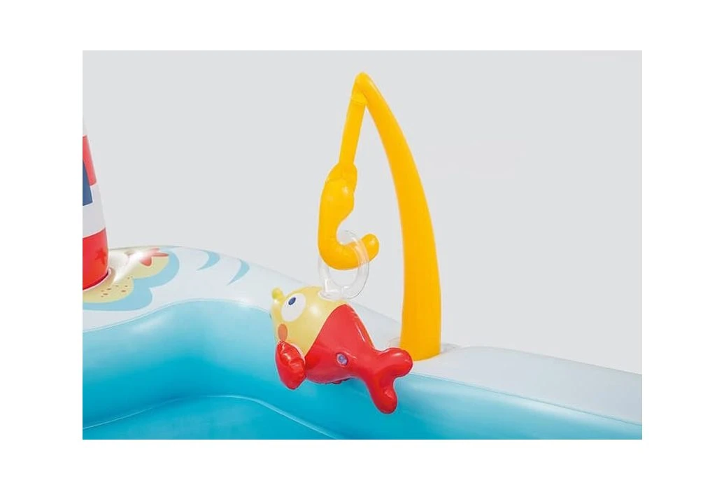 Dit leuke speelcentrum heeft een afmeting van 218 x 188 x 99 cm en een waterinhoud van liter. Het speelzwembad wordt compleet geleverd met glijbaan, vuurtoren en een watersproeiende palmboom (aansluiting tuinslang). Dit bad is geschikt voor jongens en meisjes met een leeftijd vanaf 3 jaar en . Dat wordt genieten met het hengelspel en de vissersboot!