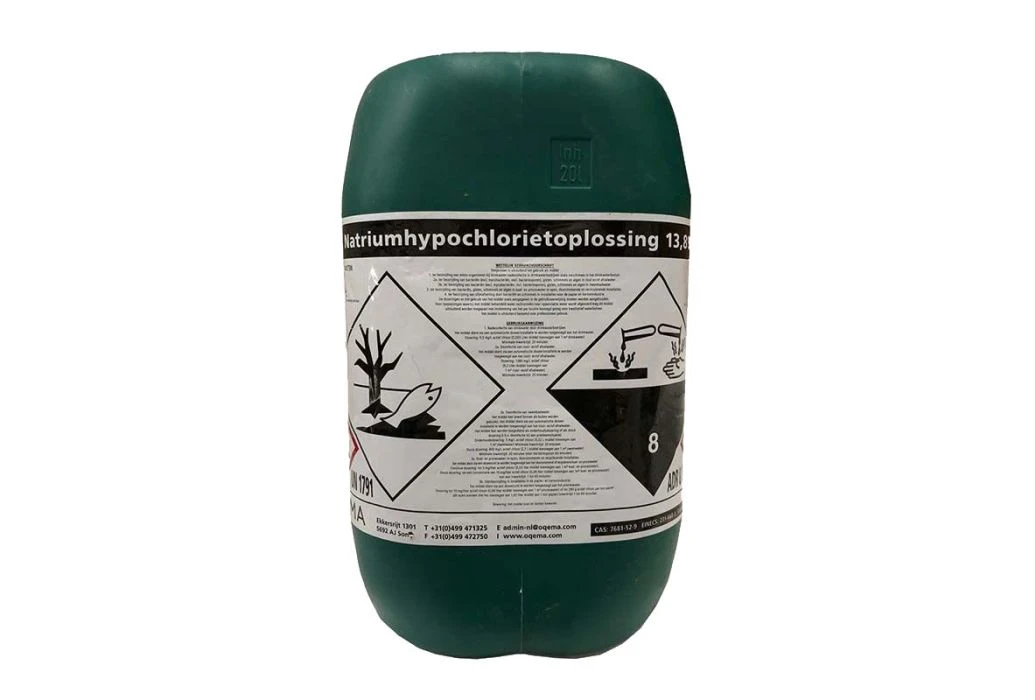 Natriumhypochloriet (NaOCl) is een heel effectief middel voor desinfectie en reiniging. Dit vloeibare chloor is ideaal voor het op niveau brengen (verhogen) van de pH-waarde van je zwembad. Bij hogere temperaturen dien je de dosering te verhogen.